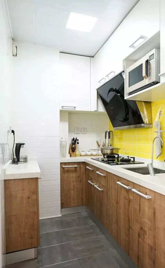 厨房内部是以木色和白色、灰色为主,打造一个轻松的烹饪空间,在橱柜和吊柜之间用黄色的瓷砖点缀,让厨房更有活力。