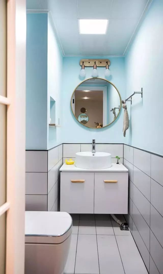 一楼的卫生间内部以蓝色和白色为主,只摆放了马桶和洗手台,方便屋主平时使用,圆形的浴室镜加上方的灯具,显得非常精致。