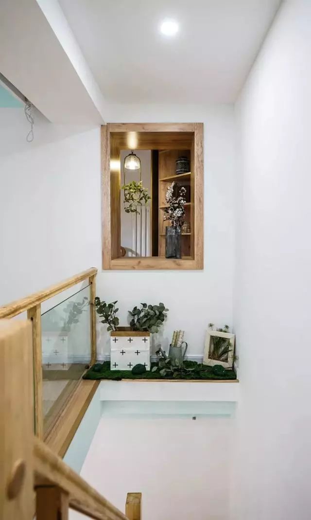 通往二楼的楼梯走道,在楼梯的旁边做了一个小景观,上方的窗户是开往了书房,这样的设计让人感觉非常文艺。