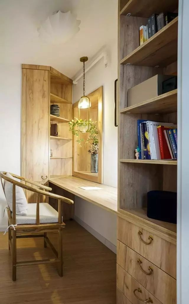 以木色和白色为主的书房空间,在窗户上吊着复古的灯具和绿植,搭配木质感的书桌柜、椅子,整个书房既实用又美观。