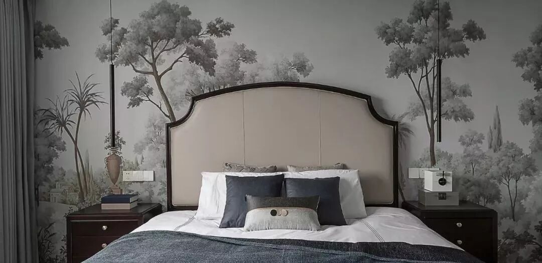 主卧,原木色地板搭配灰白窗帘,无主灯顶面用点光源与深色饰带修饰,定制款壁纸搭配卡其色皮质高背床,对称线性壁灯取代台灯设计。