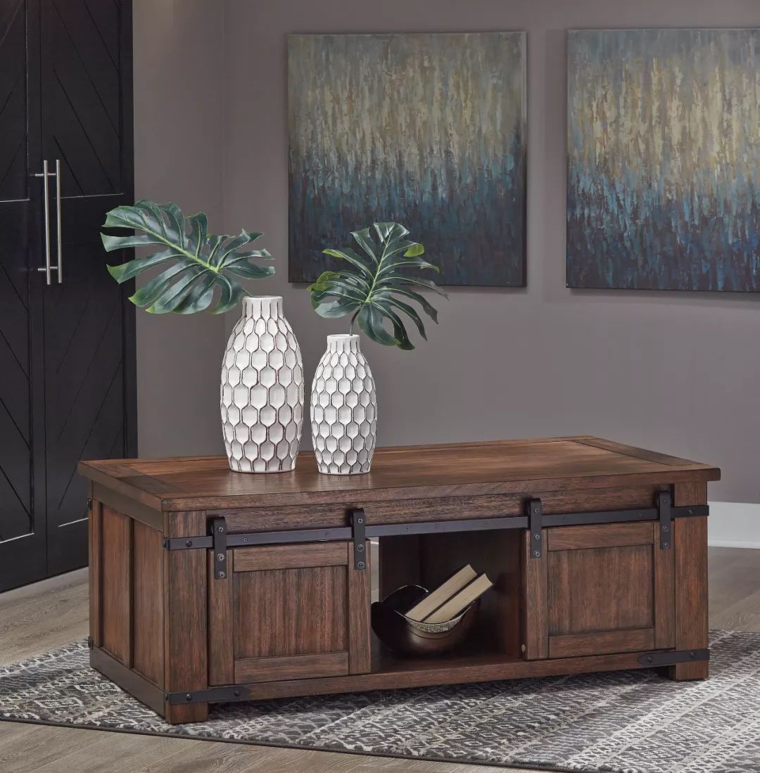 也可选择谷仓门款式的茶几,谷仓门造型时尚复古,设计感强,可轻松搭配各种客厅风格。同时它拉门的设计可自由移动,不占用额外空间,使用便捷顺畅。