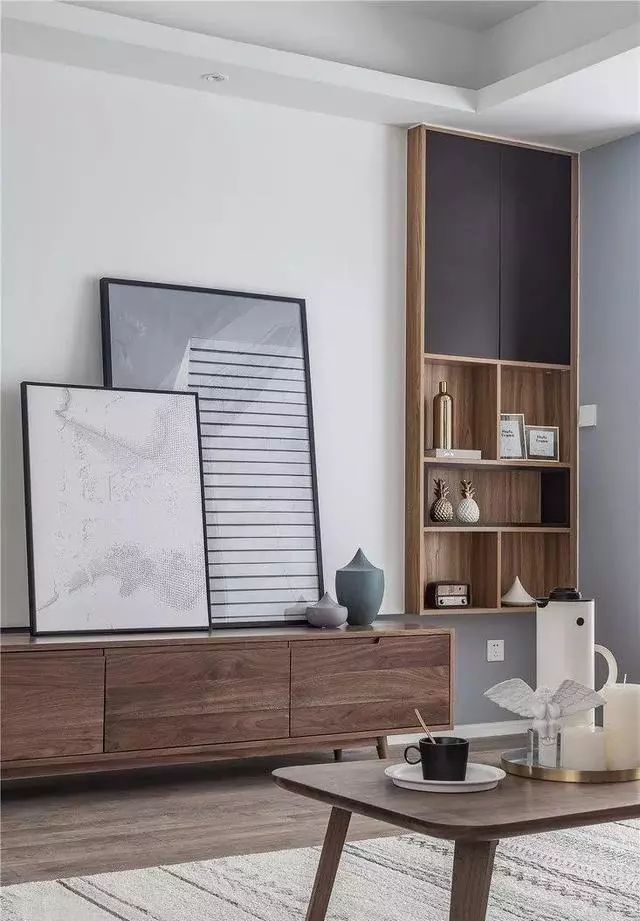 客厅的沙发背景墙旁边还设有一面白色的收纳柜既实用又好看~