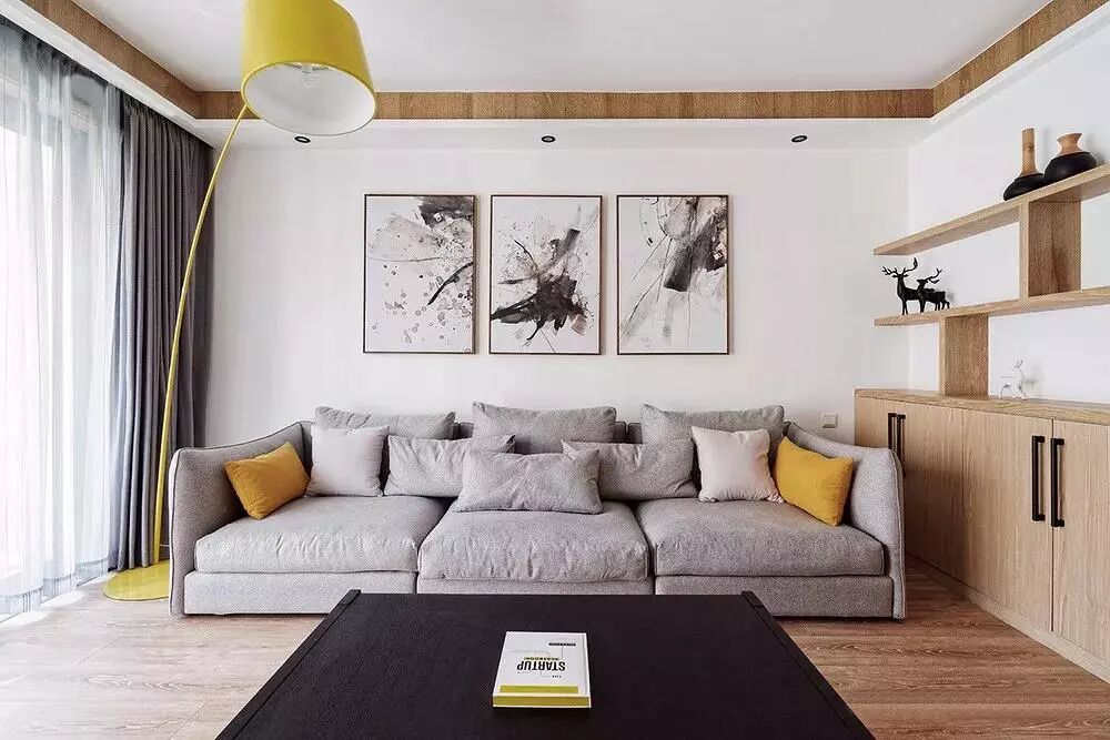 灰色的布艺沙发,与墙面水墨风装饰画遥相呼应,一盏柠檬黄北欧落地灯,点亮看空间色调。