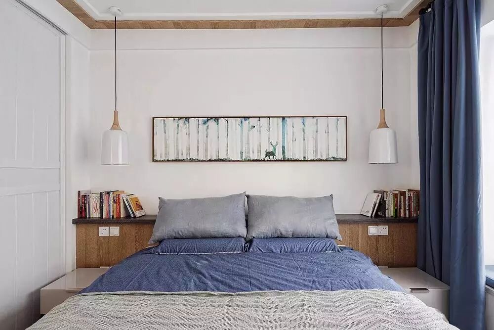 床头墙面设计了一条半高的矮墙,取代了床头板,上方可以收纳书本,新颖又实用的设计。