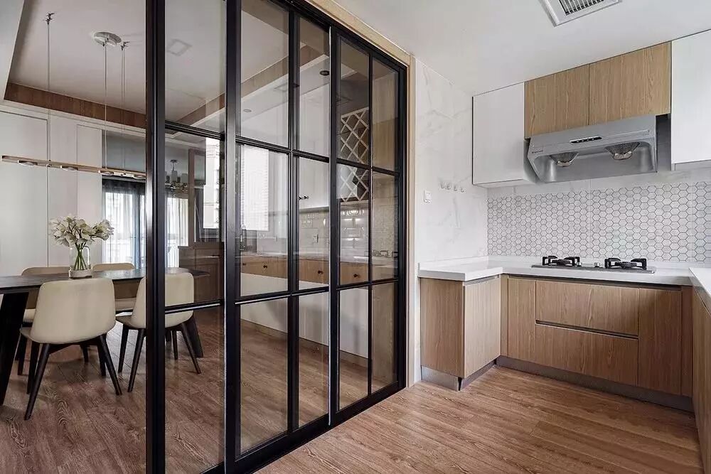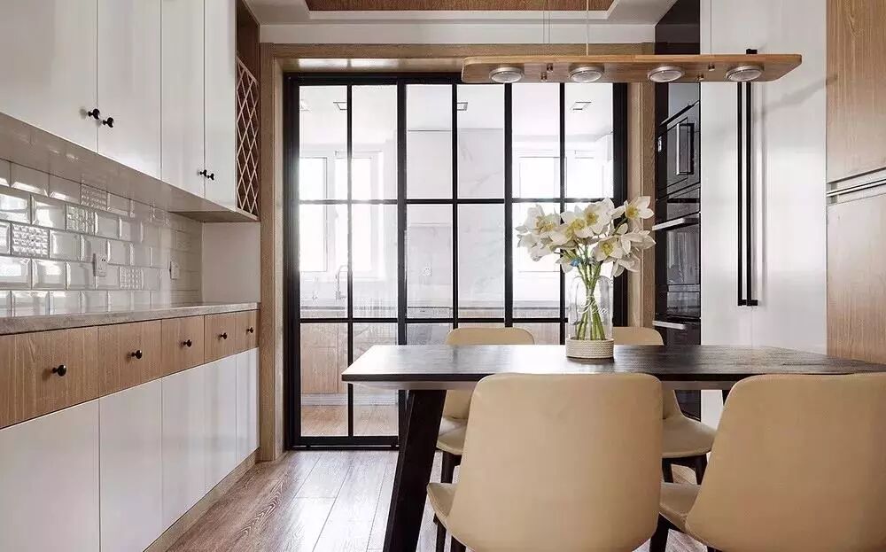 餐厅布置简单又不失格调,和厨房的隔断采用玻璃门,引进自然光线。