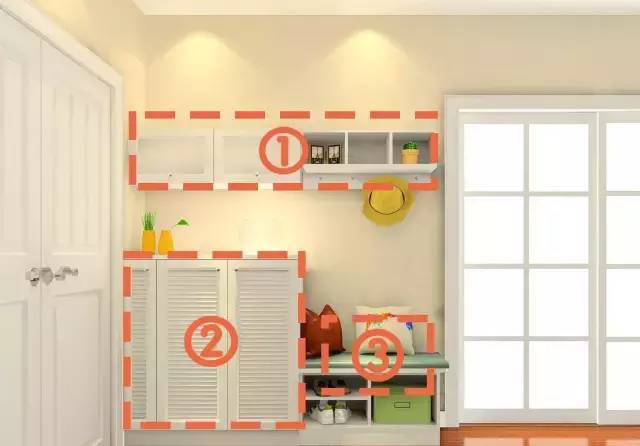 ①:玄关处上方空间可以放雨天才会用到的东西。②:鞋柜处可以分季节分类型放鞋子。③:卡座下方可以放经常穿的鞋子,提高出门效率。