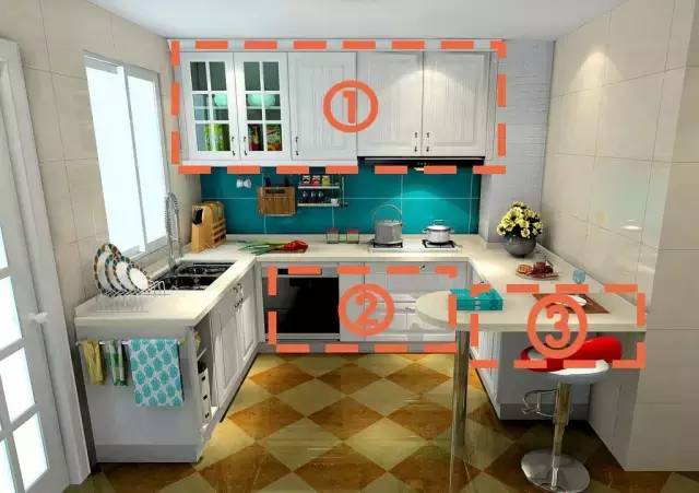 ①:顶柜绝对是厨房杂物的最佳收纳地儿。②:底柜可以加入碗柜等的设计,便于拿取与收纳。③:吧台的设计既有情调又可以当成是临时放菜点,很实用。