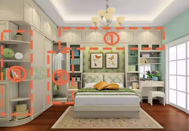 ①:顶柜可以放一些过季的衣物和床上用品。②:转角处空间充分利用起来,这里可以弄一个可以旋转的挂衣通。③:开放式柜子的设计,方便拿取东西,又可以放点装饰物。