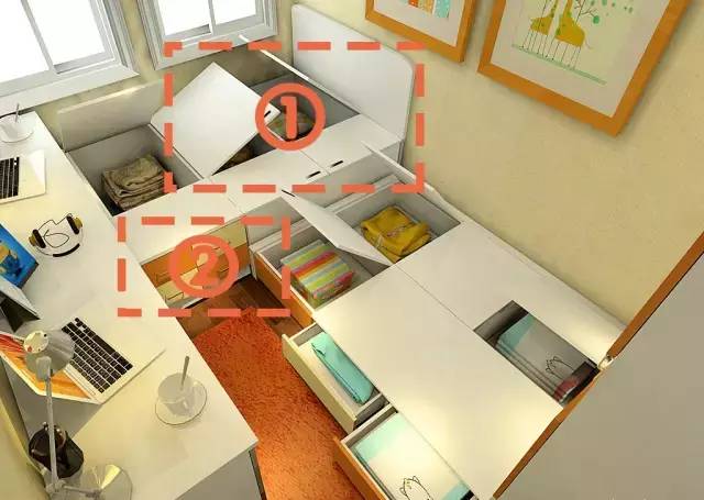 ①:榻榻米放在书房再合适不过了,又用强大的收纳功能,还能变身成客人的休息区。②:榻榻米下方还带有抽屉,这里也可以当成杂物收纳处。