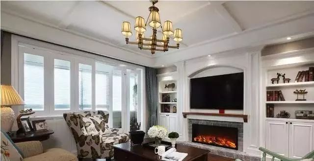这个角度看往电视背景墙,墙面上全白的装饰,中间位置放置电视机,下边做了个仿真的壁炉。两边坐的是嵌入式的收纳柜,简单实用还相当的美观