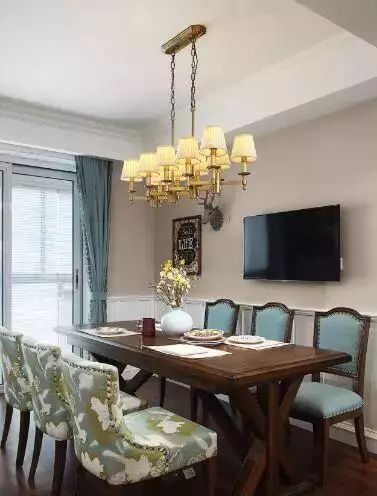 餐厅墙面上也安装了电视这样能一边看电视一边吃饭了。墙面上还用画作简单的装饰下墙面不会显得空荡荡的