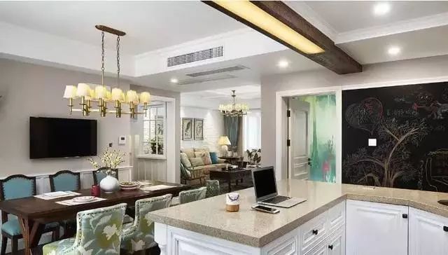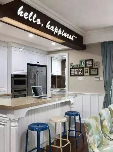 吧台位置看整个餐客厅,整体上的格局还是很不错的。吧台位置全定制了好多的收纳柜,满足收纳需求,墙面上还设计了黑板,可以在上边涂涂画画的