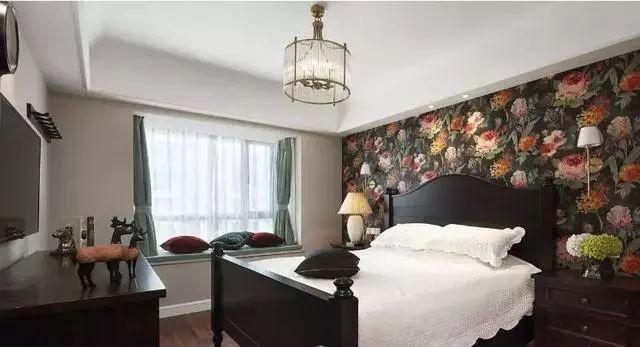 卧房,房间的光线很好,整体上的装饰温馨舒适。房间选择深色的家具作为主体颜色,大气浅灰的墙面,床头鲜花墙纸作为一个重中之重的启程点,整体布置完超美的,超喜欢的
