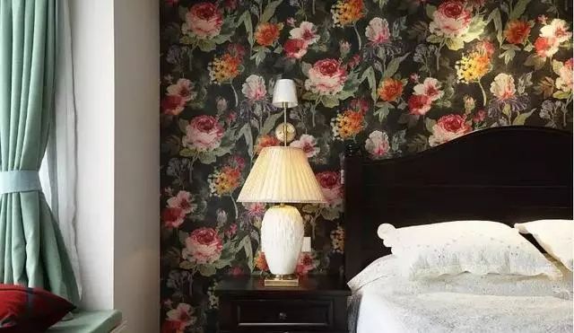 床头的位置全贴着鲜花样式的墙纸,大气芬芳。床边放置一张简单的床头柜,简单实用上边摆放着台灯。窗户带来光线的同时还设计成飘窗,既美观还实用