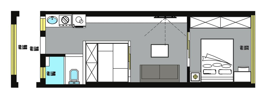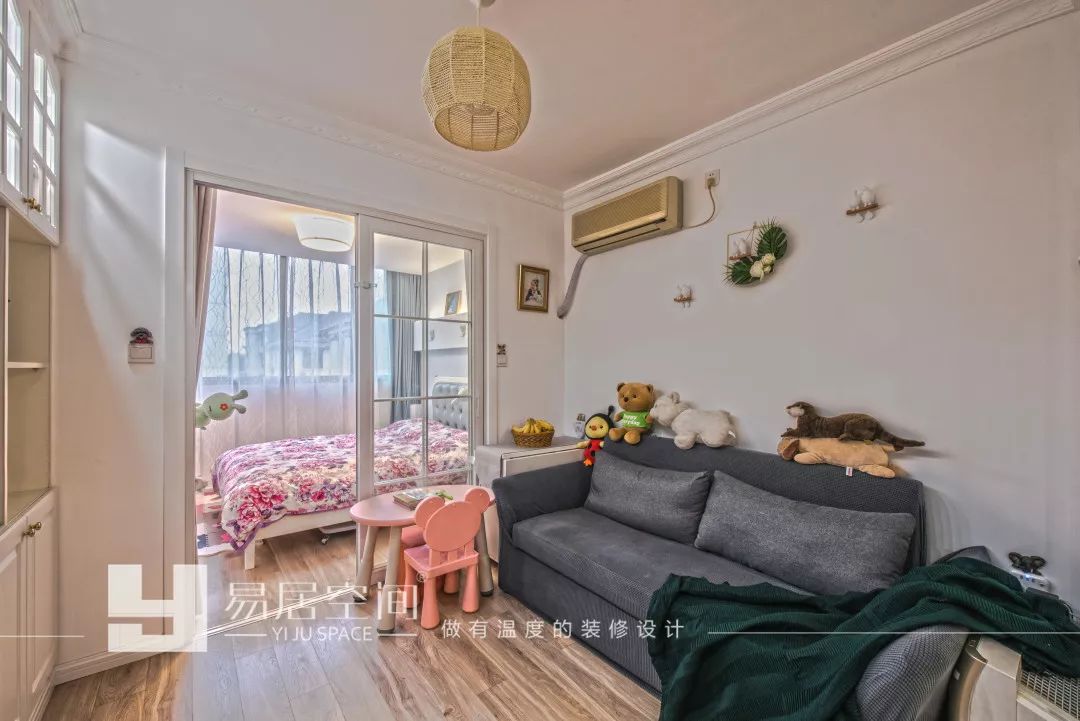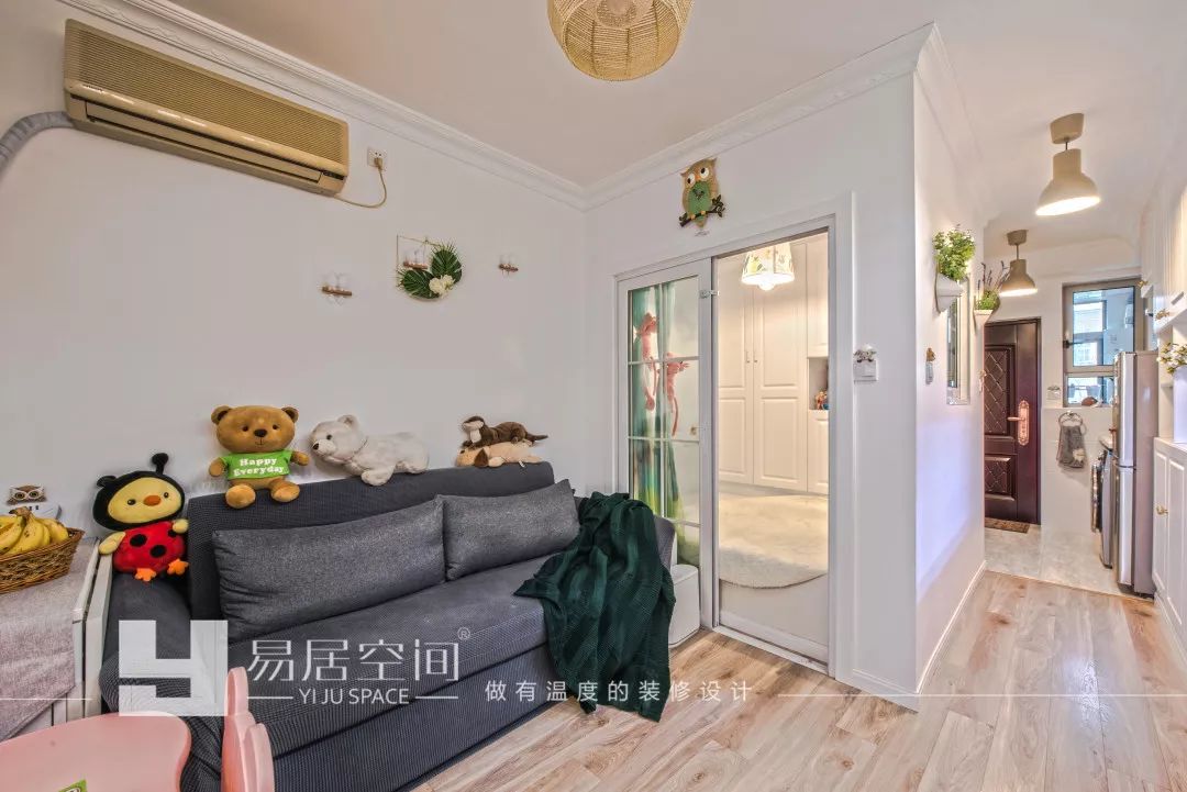 本身这是一个条头糕的一室户,因为业主是一家三口住,但是宝宝才3岁,所以不需要很大的空间,便从客厅分割出一块区域做次卧,另一侧又开了一扇内窗,保证了空间的通风。