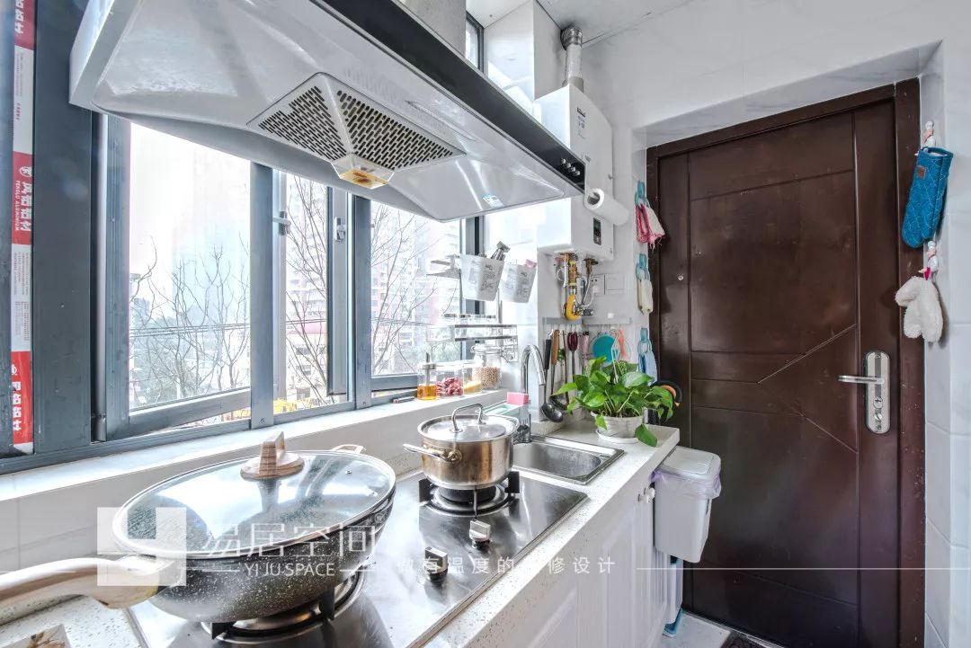 这是上海常见的老公房户型,条头糕,厨房算在公摊面积。进门右手就是厨房的区域,白色石英石搭配白色门板,显得空间通透敞亮。这虽然面积较小,但是这也很好的隔断了油烟对家里造成影响哦。