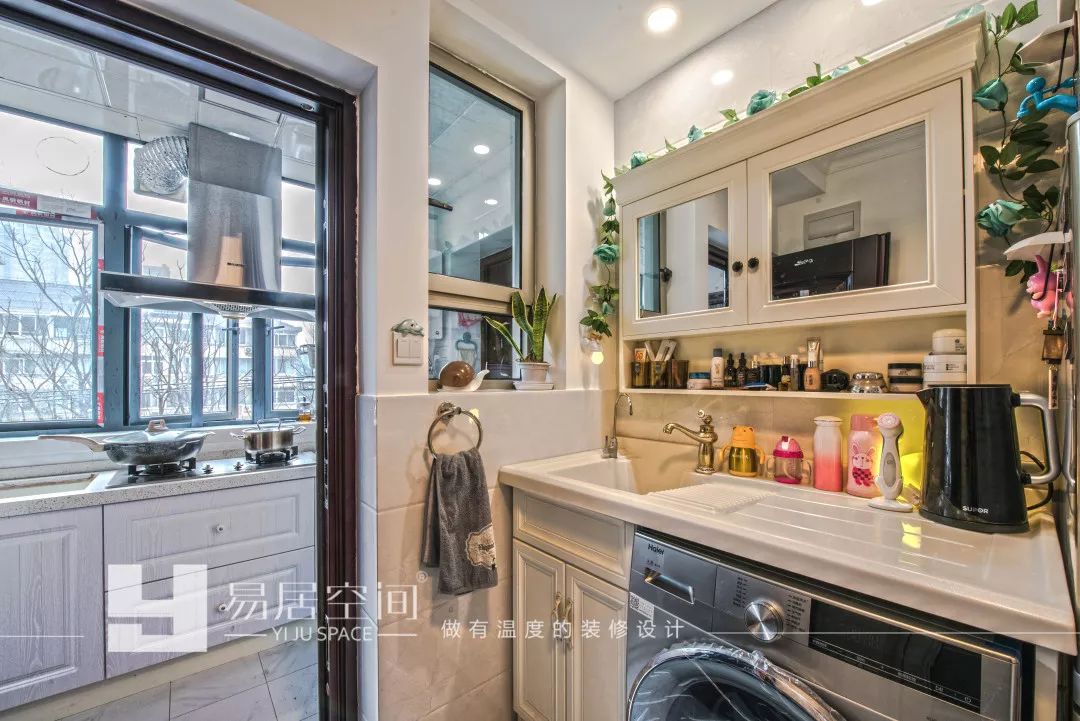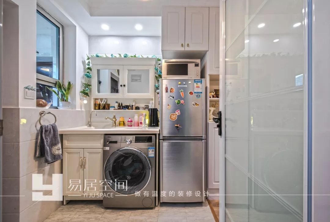 开门的左手边就是干区,洗衣机和洗手台盆利用洗衣伴侣结合在一起。
