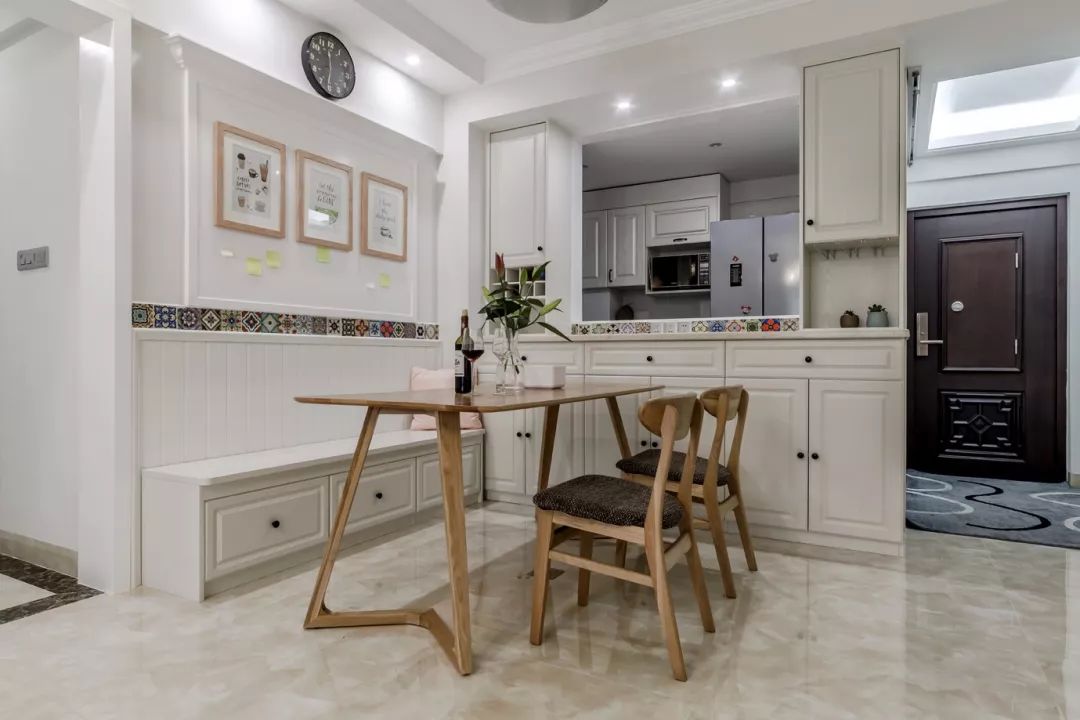 入户玄关过后就是餐厅空间,餐厅和厨房之间留下了一个窗洞,更方便递菜,也把餐边柜等收纳都集合在了一起。