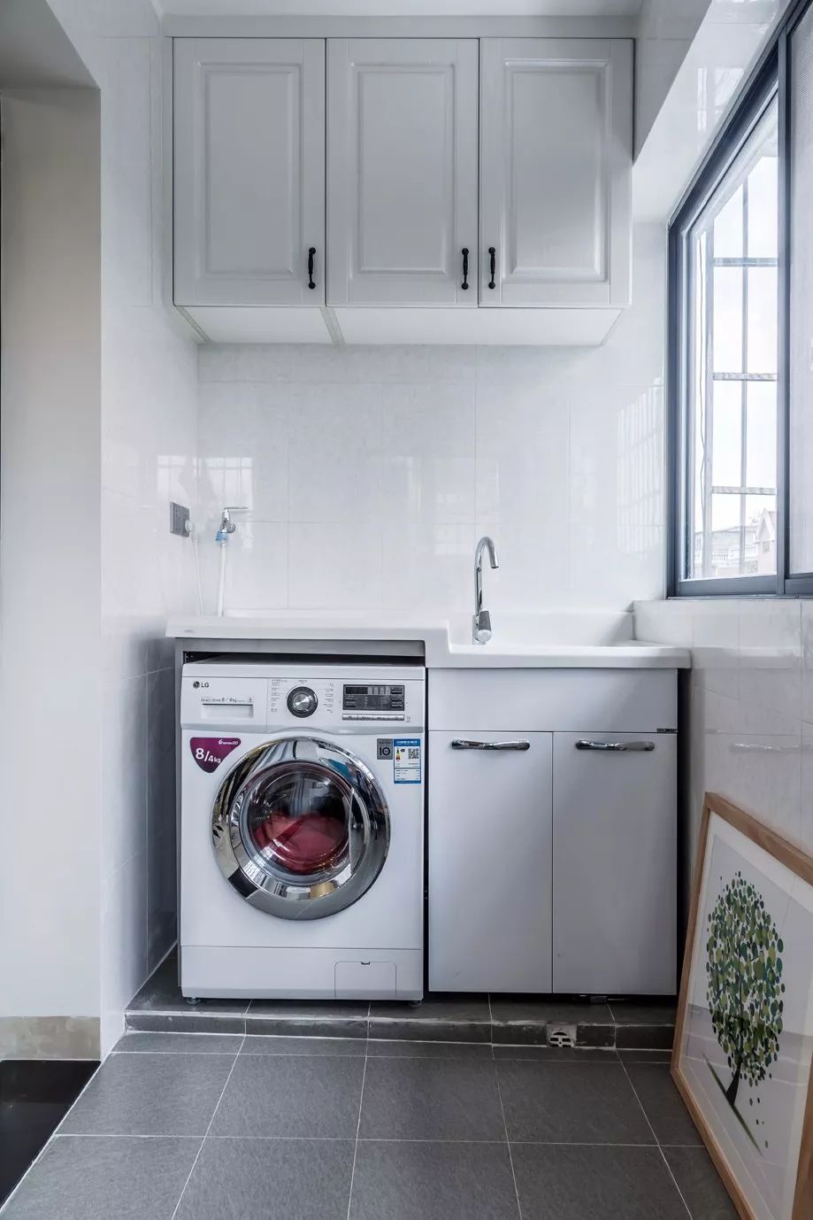 阳台位于客厅之外,中间没有做推拉门,也是为了让客厅看起来更为宽敞。在阳台一侧摆放洗衣机和做个洗手台,非常的实用。