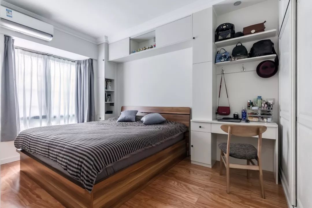 主卧室的床头背景墙和沙发背景墙做法类似,用柜子来代替床头柜,上方还有吊柜,可以拥有超多的储物空间。