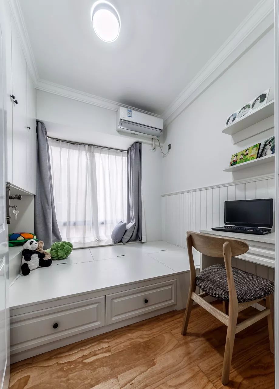 次卧作为孩子的房间,摆放一下张单人床和书桌即可,嵌入式的到顶衣柜非常适合小房间,更省空间。