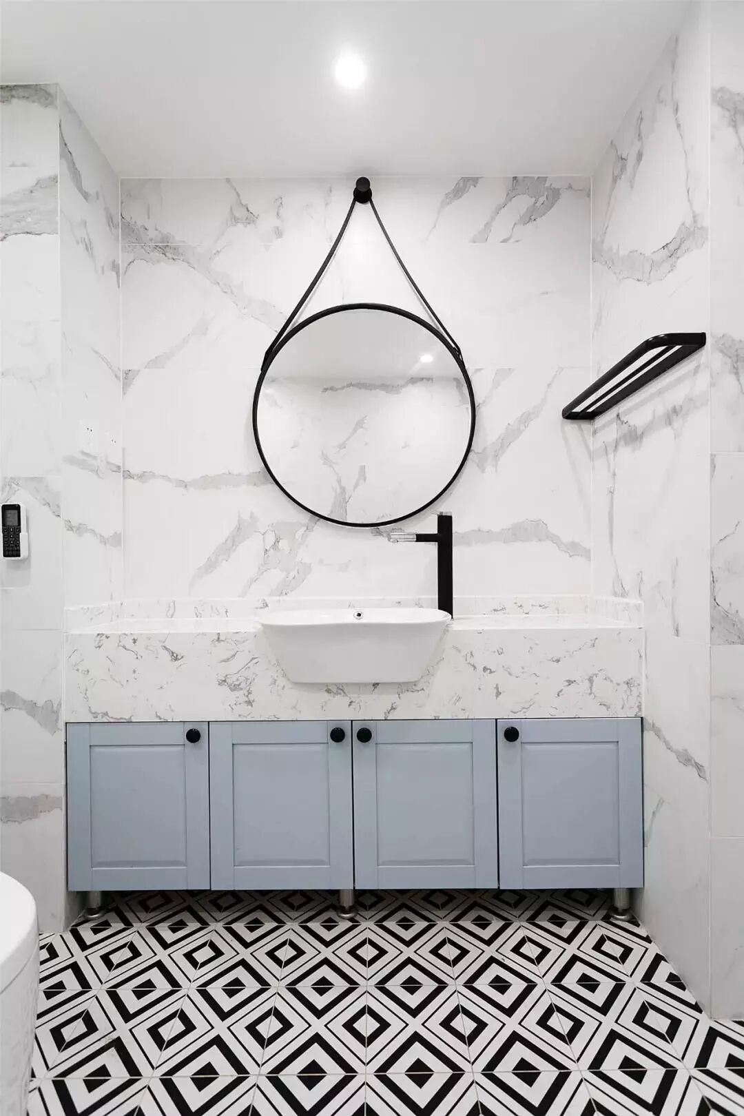 ▲主卫墙面铺仿大理石瓷砖,地面是经典黑白配色花砖,洗漱盆外凸,让洗漱台和墙面柱子齐平,空间更规整,也让马桶区更舒适。