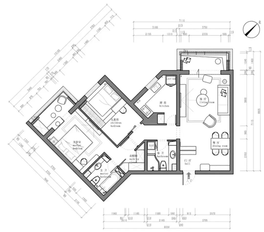 ▲这是一个不规则的户型,但是布局紧凑,不方正的空间也巧妙布置成厨房、衣帽间,充分利用了尖角。