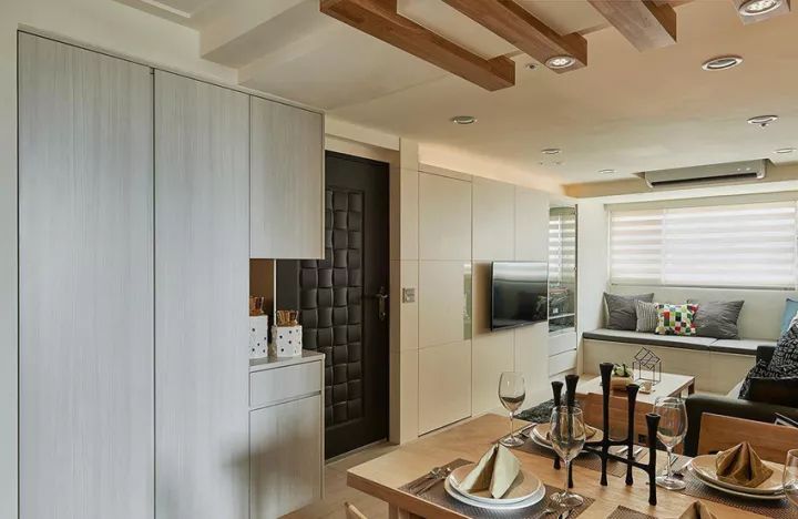 在电视墙后方以隐藏门的方式,规划一间储藏室。