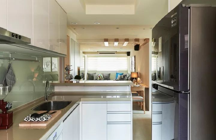空间拆除厨房的实体墙改造成客、餐厅与厨房一体的打空间格局,无形中也放大了空间的尺度。