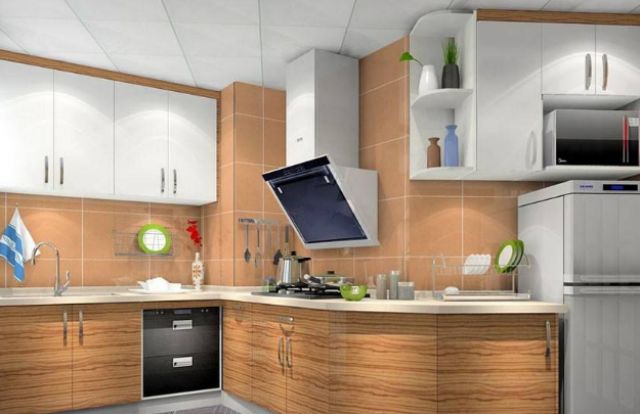 厨房就在餐厅的旁边,墙砖和地砖都是浅灰色的,橱柜是颜色比较深的原木色,这种搭配还不错。