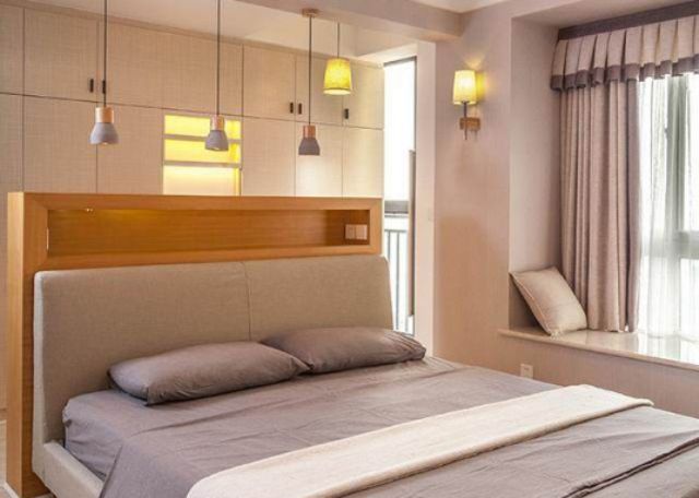主卧装了简单的吸顶灯,没有做吊顶,放了一张简单的布艺床,床头是木质的柜台,后面一整面墙都是衣柜。次卧的感觉比较小清新,床头的墙面刷成了浅蓝色,放了一张浅色布艺小床,墙上还挂了两幅简单的画,搭配的很舒服。