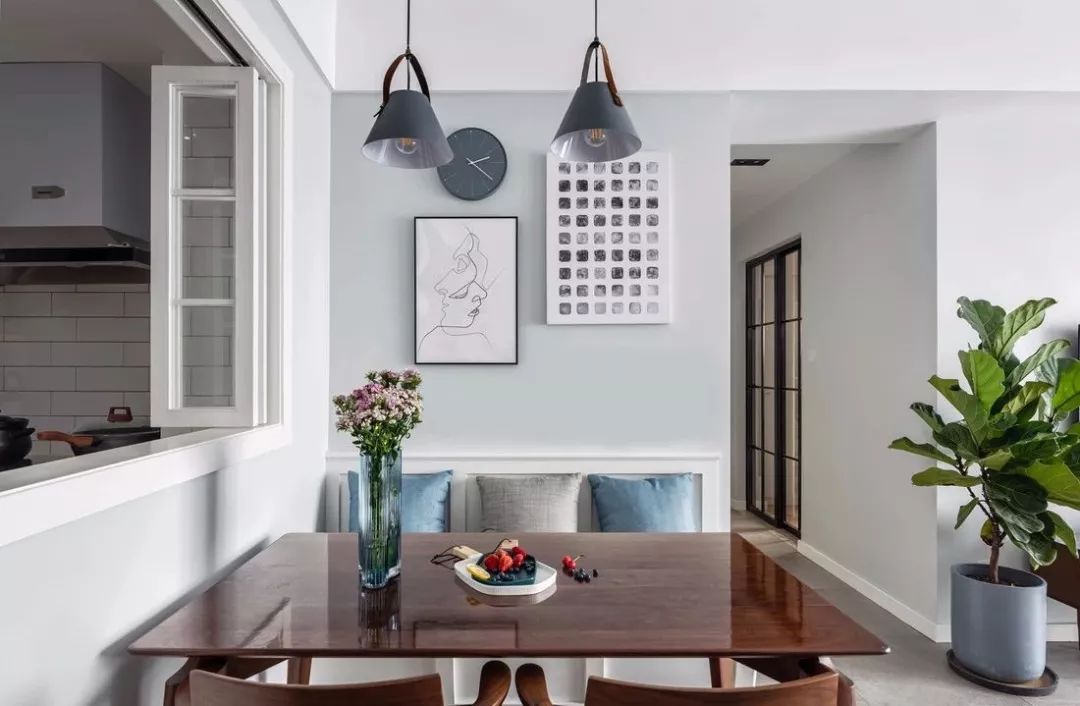 ▲餐厅与厨房相连,内开窗的设计增强了交流与互动,也使空间更具通透感。利用转角设计了卡座,充分利用空间、提供收纳功能的同时,也制造了这一角落的小浪漫。