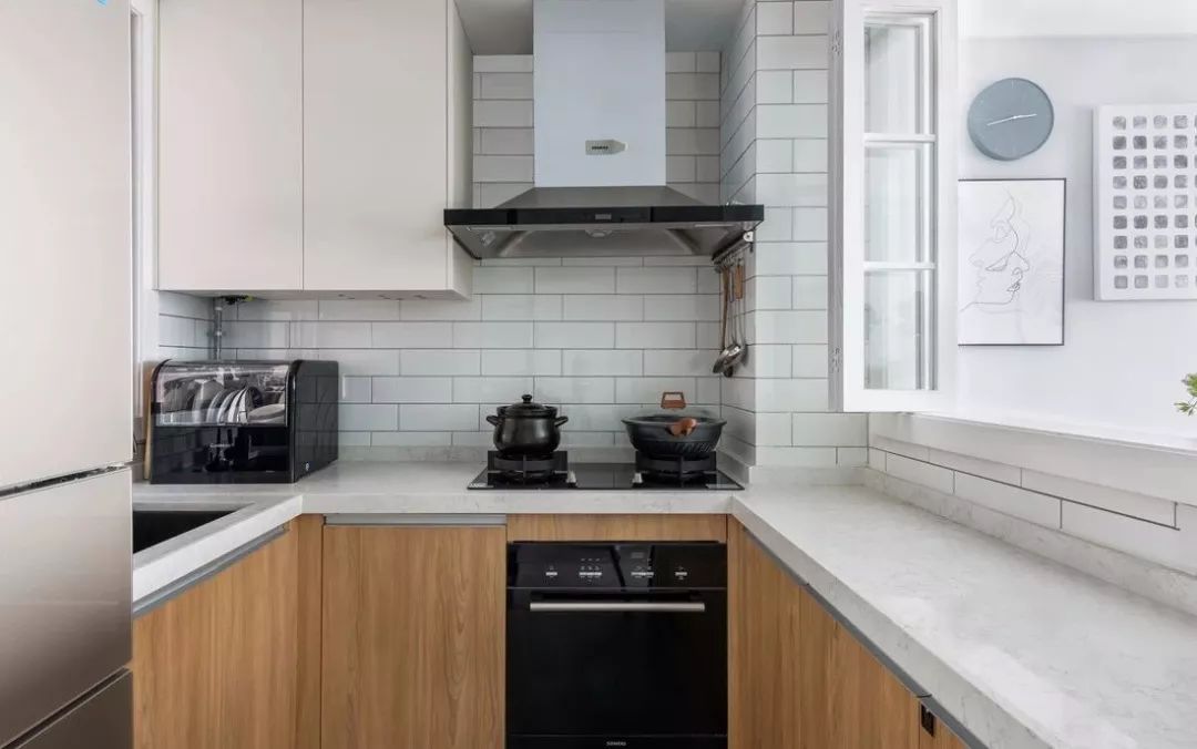 ▲厨房整体以白色为基底搭配木色橱柜,并借由内开窗引入光线,使空间更为干净明亮。