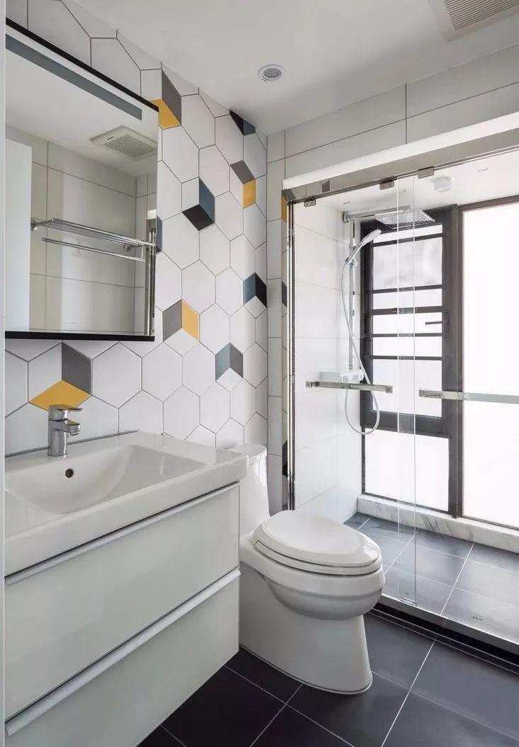 ▲卫生间黑白两色经典搭配,文艺六边砖中加入不规则的色彩点缀,瞬间丰富了许多。
