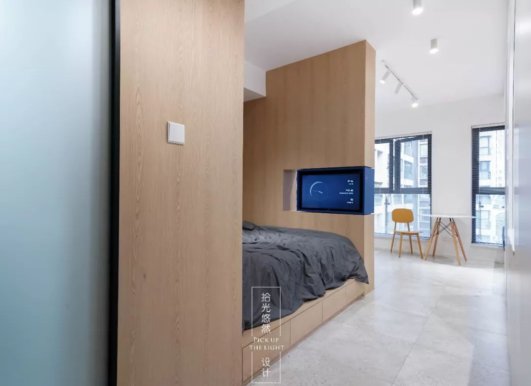 本案在没有改动原来墙体的情况下,对动线进行了调整。通过在吊顶中横向预埋烟道的方式,将原本应该位于进门处的厨房,规划到了靠窗的位置,与客餐厅结合,形成餐厨结合的布局。小公寓里面的每一寸空间都很重要,我们把地台床被规划在了中部,位于通道左侧,而通道右侧则是正面通高衣柜、收纳柜,满足了业主对收纳的需求,极大的提高了空间利用率。