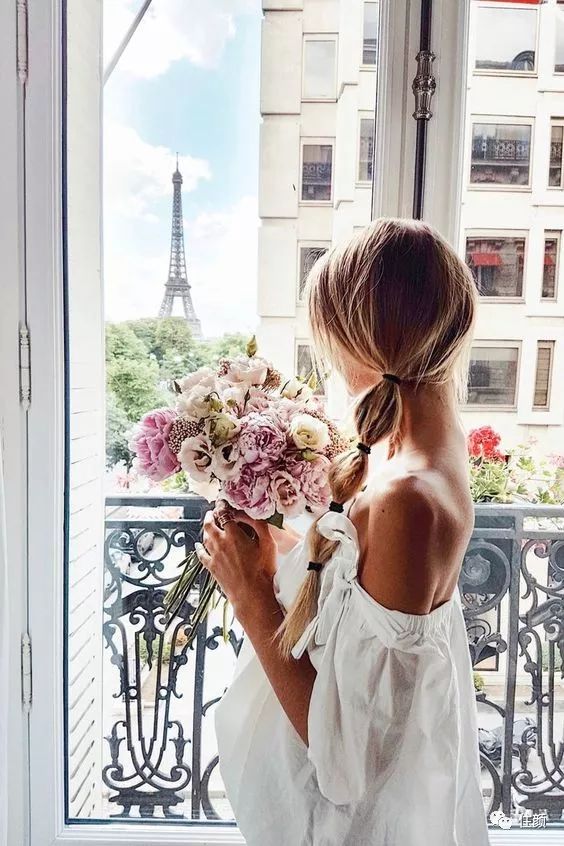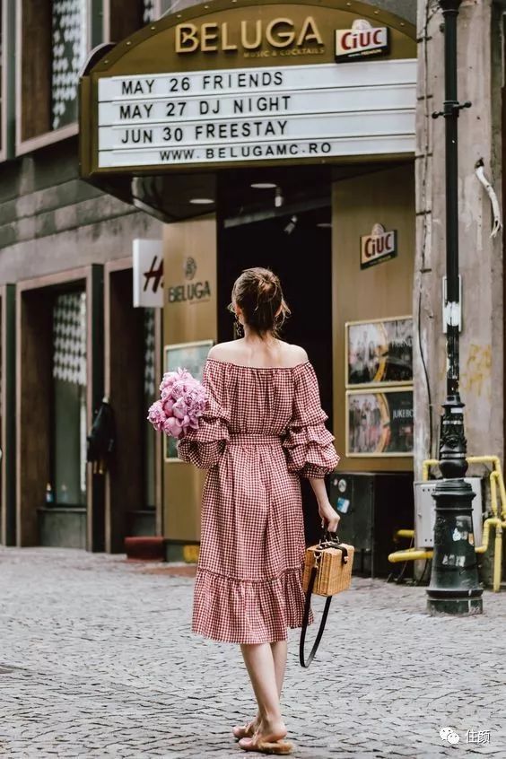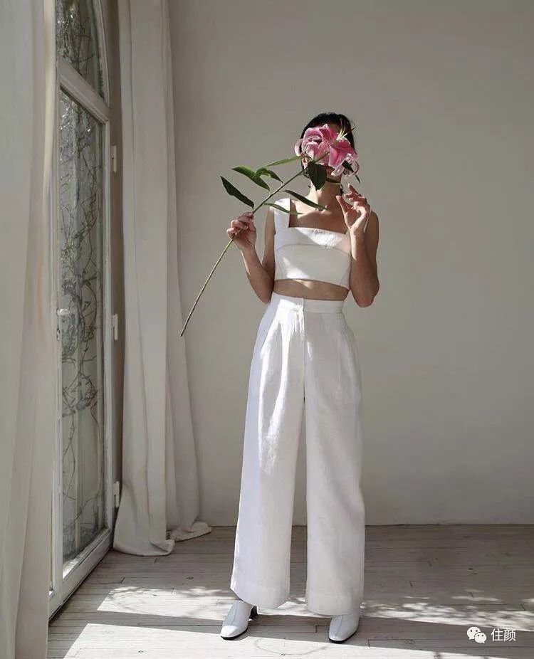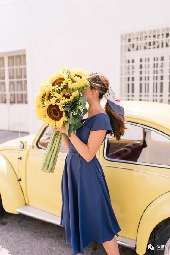 垂放的手自然拿着花束,穿件简洁清爽亦不失慵懒性感的裙装,效果更Effortless Chic。