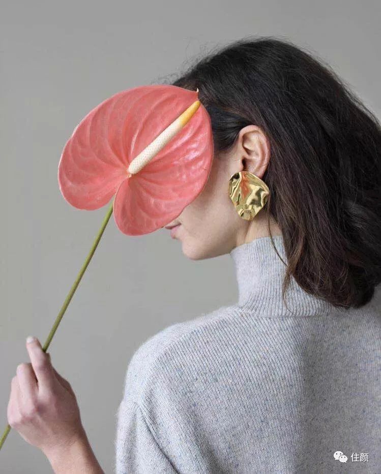对于大枝且很有造型的感的花,一两枝即很有画面感,巧妙地遮住侧脸,微露出一些眉眼神韵、轮廓线条,低调中展现若隐若现之美。