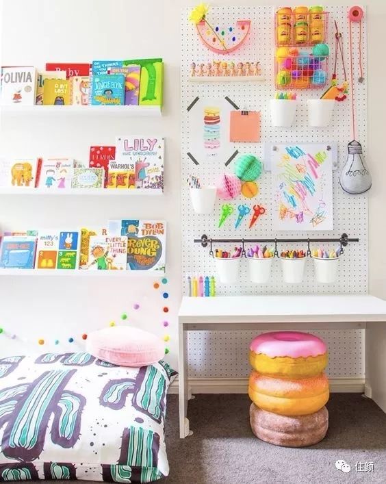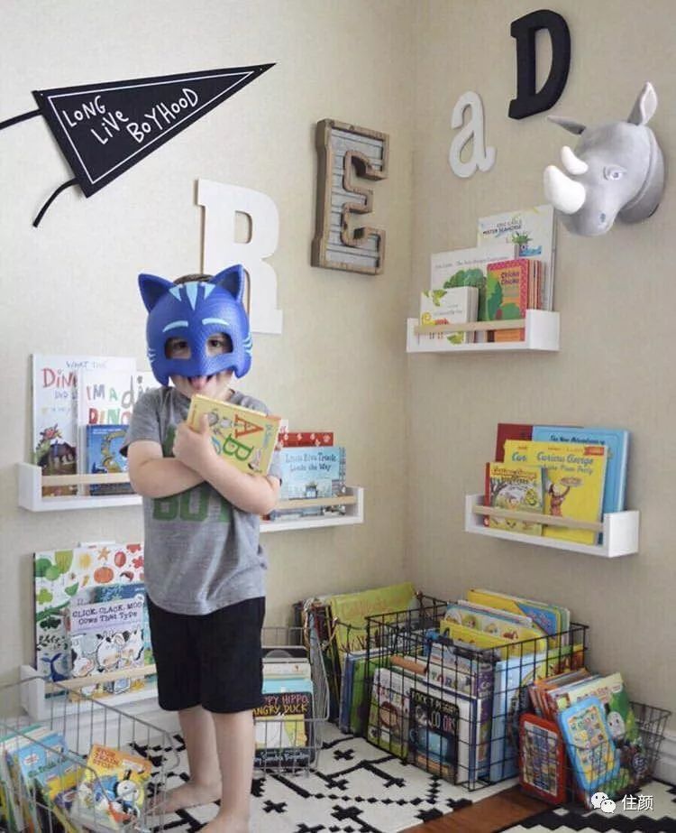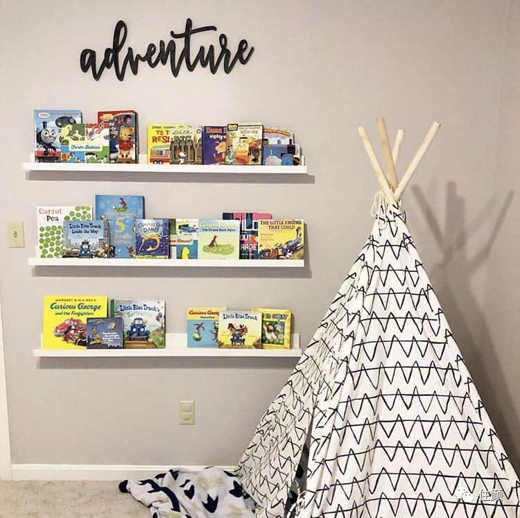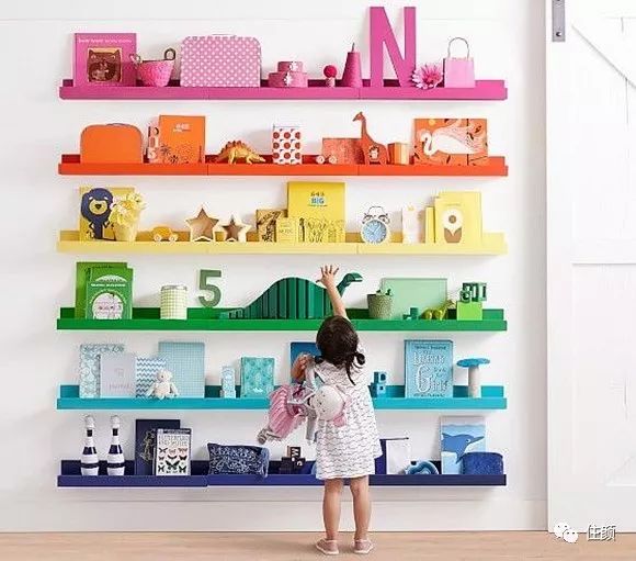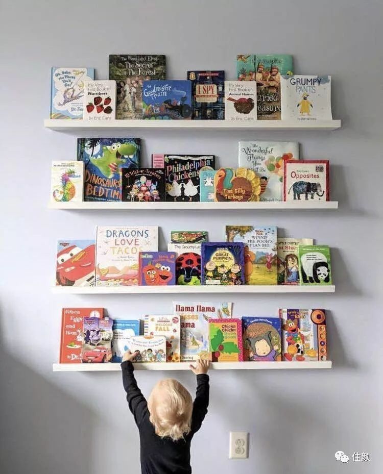 每个孩子都少不了一堆的儿童书籍,将书籍放在墙面隔板上,也很具有文艺气质呢~