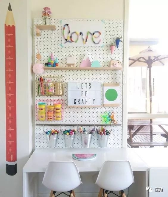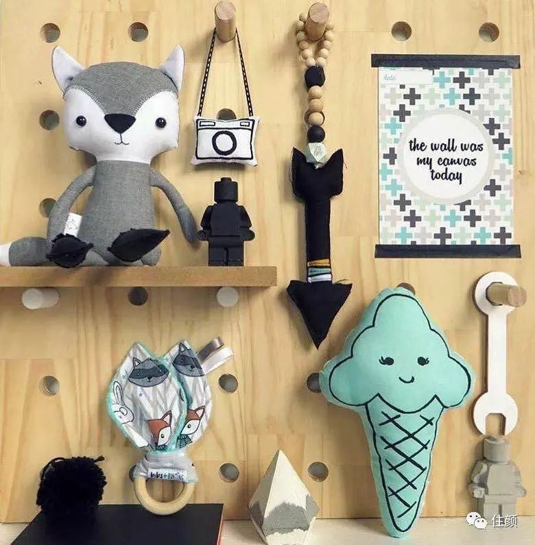 利用好墙面空间,当然少不了收纳工具加持。当下收纳界网红装备洞洞板,也可以放在儿童房内,玩转收纳花样,也是美化空间的展示利器。