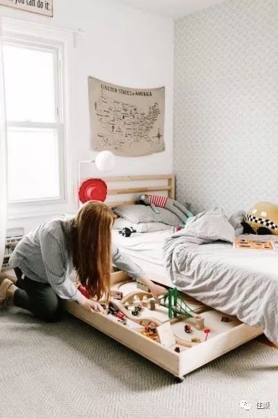 孩子活泼好动的天性,让他们的玩乐场所经常不是那么固定,可以在房间内添加一些可移动式收纳装备,方便哪儿需要搬到哪里。