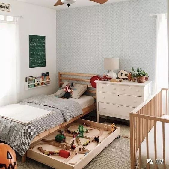 对于面积不大的房间来说,空间利用是一门非常重要的学问。床下添加抽屉设计,用来存放一些常用到的玩具,孩子也可以自己取放。