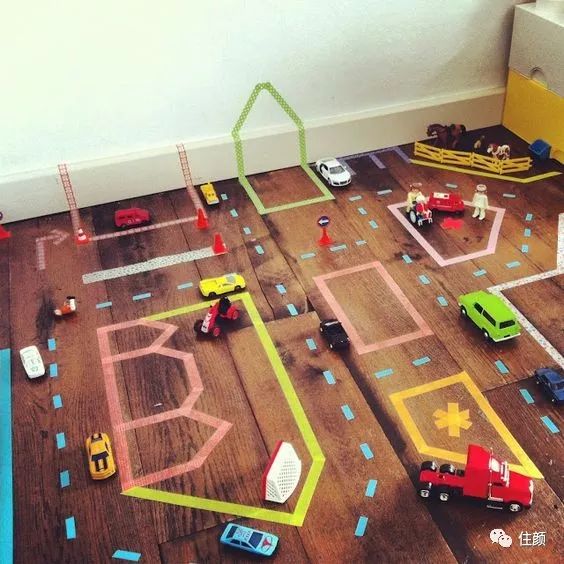 男孩们钟爱的汽车玩具,随意丢在地上总是凌乱不堪。不如划分出一个专属地面区域,用彩色胶带给车子划分“车位”,兼具游戏的形式,培养孩子物归原位的习惯。