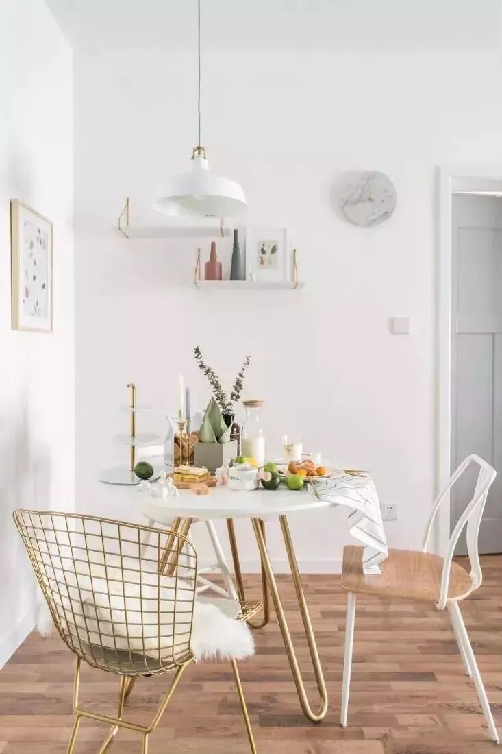 餐厅布置得十分高雅,金色金属+白色+原木,清新之中还有轻奢感。