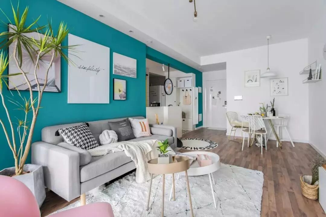 沙发墙刷成绿色,增加了空间活力,灰色布艺沙发+原木细脚支撑,减少了厚重感。