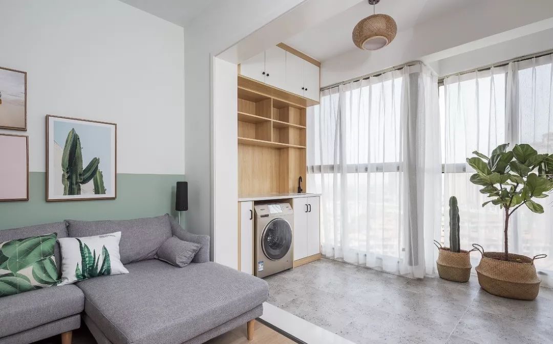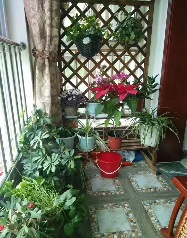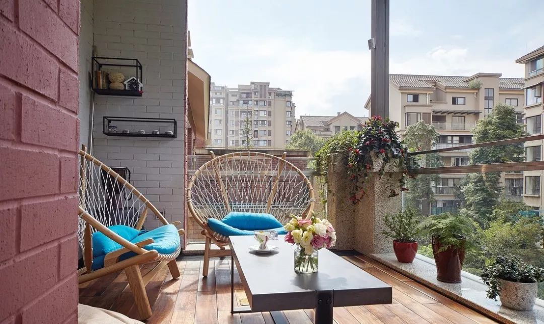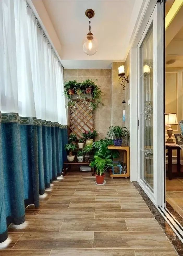防腐木也可以用在阳台中,它的实用性还是很强的,不怕水、不怕晒、防潮、防霉、防虫,配合些花花草草,宛如一个花园。但是,缝隙多又偏大,容易落灰不好清理,比较适合开放式露台或者庭院,家里的不太建议使用防腐木。