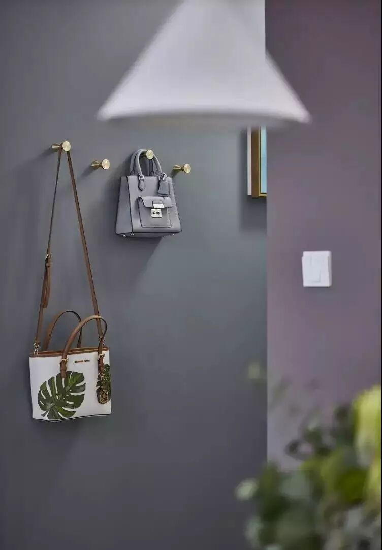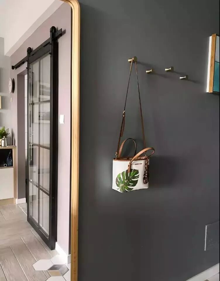 灰绿色墙漆,搭配上金色金属挂钩,十分复古,挂什么都很美。