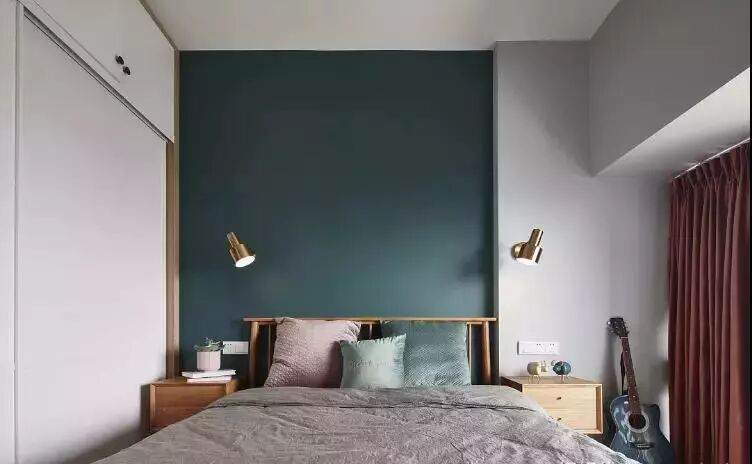 主卧墨绿色墙面,不需要任何装饰,就打造了静谧的睡眠空间。房梁下边安装薄筒灯,脏粉色窗帘也搭配得十分协调