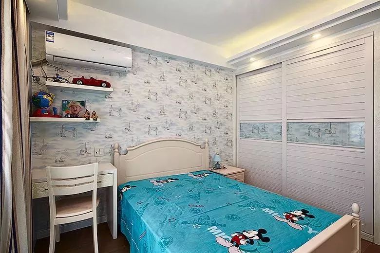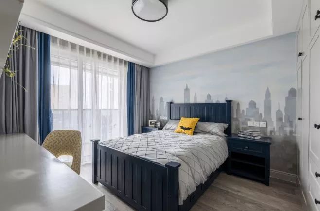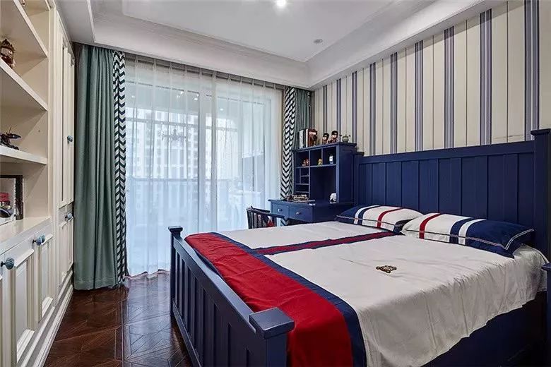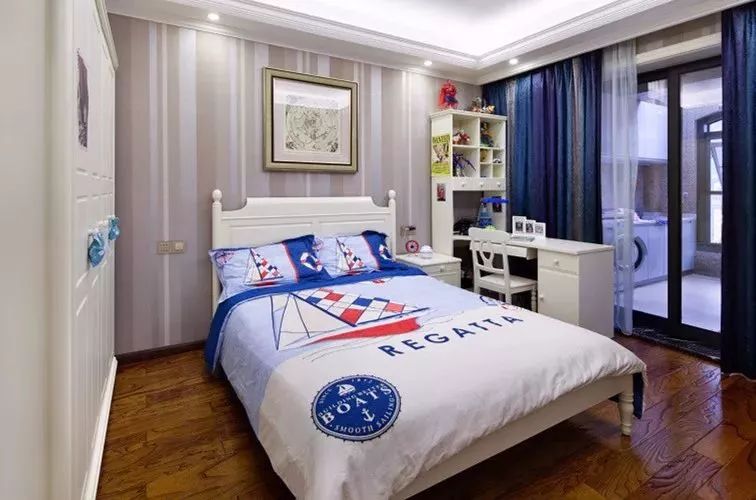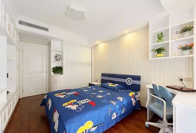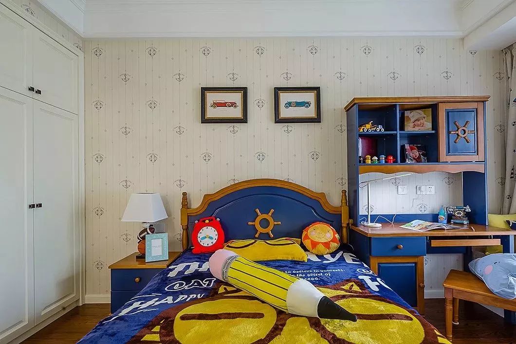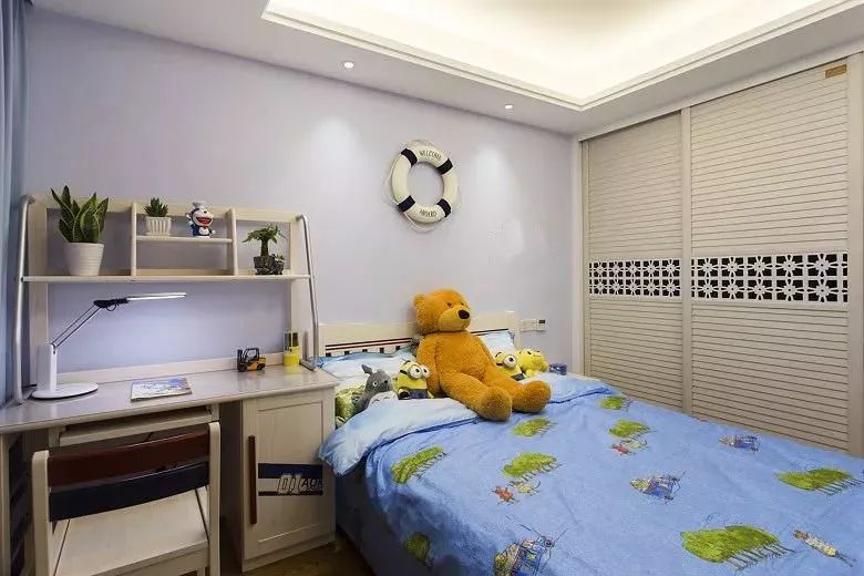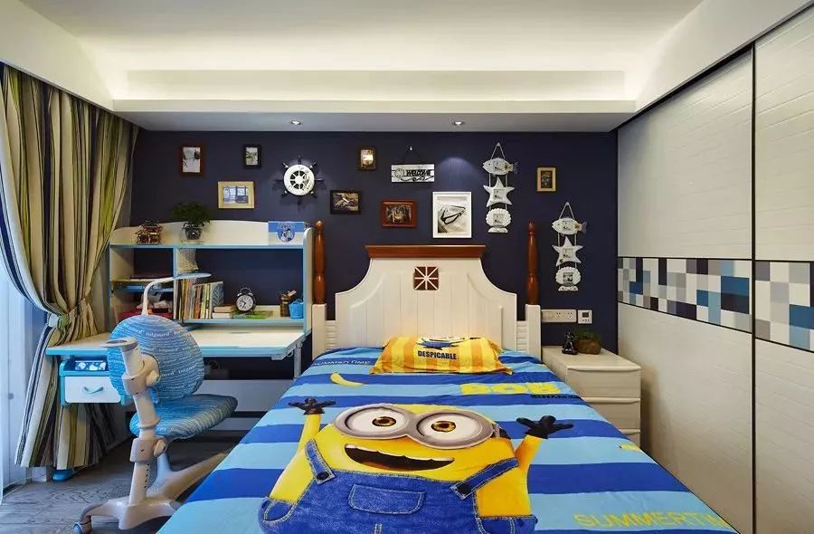 男孩房一般以蓝色调为主,年轻活力的空间,跟孩子朝气的年纪相互搭配很合适。