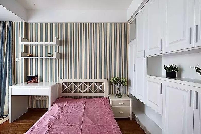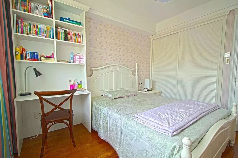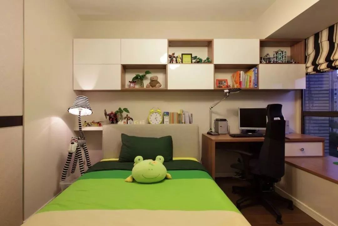 两个孩子共用一个房间的时候,就可以充分利用门口和床头的空间,放下两个书桌也未尝不可。